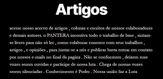 O Pantera preza por manter nossos camaradas sempre informados , seja em nossas noticias diárias , artigos , posts e demais mídias . O primeiro passo sempre vai ser a conscientização , união e articulação entre os nossos para podermos então lutar . Nossa frente é revolucionária e emancipadora como seus ideais primeiros , seja quem for e você que está lendo , se não se conforma com o mundo distópico que vivemos e quer fazer a diferença , não deixe a realidade te abater , deixe ela te radicalizar . todos são bem vindos a militar , escrever , articular e apoiar ativamente nossa luta .